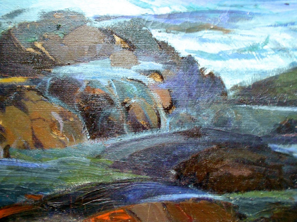 The painting contains the wonderful, highly distinctive broken brushstrokes of the artist; surf flowing over Southern California Rocks, with some shadows reflected in evening shadows. His painting technique is amazing and masterful; almost bordering on realism with his sweeping lines, and confident, masterful approach. Appearing very real; this rare quality in impressionism elevates this painting far beyond the standard of a simple Plein Air. The colors are brilliant; the light effects are extraordinary. The location appears to be the rocks and surf, in Laguna Beach. Edgar Payne had a framing shop in Laguna Beach and spent his free time painting the California coast. He was profoundly moved by the quality of California light; in his paintings, striving for the perfection of the exquisite natural beauty of how the light fell on the mountains and water. This body of work, reflecting the artist's dedicated, and endless pursuit of perfection, in capturing this light effect in his paintings, would become the cornerstone of California Impressionism, and set a high standard for California Plein Air Painting, for decades to come. It is no wonder the artist is one of the most beloved, and gifted artists, in the history of California.