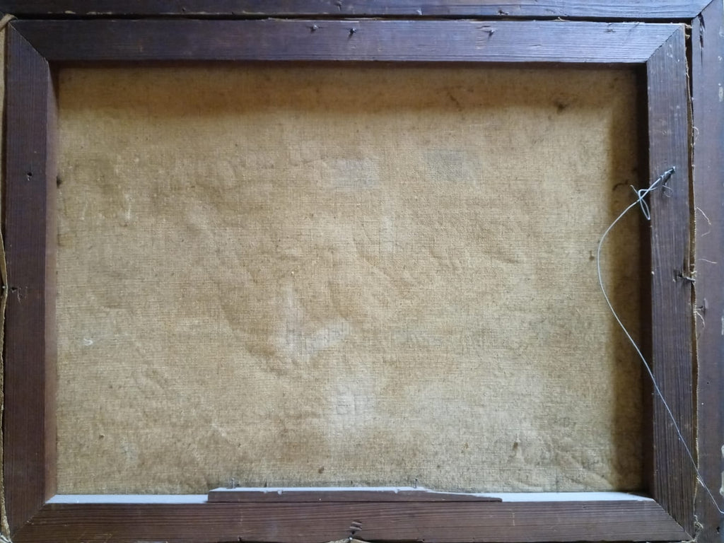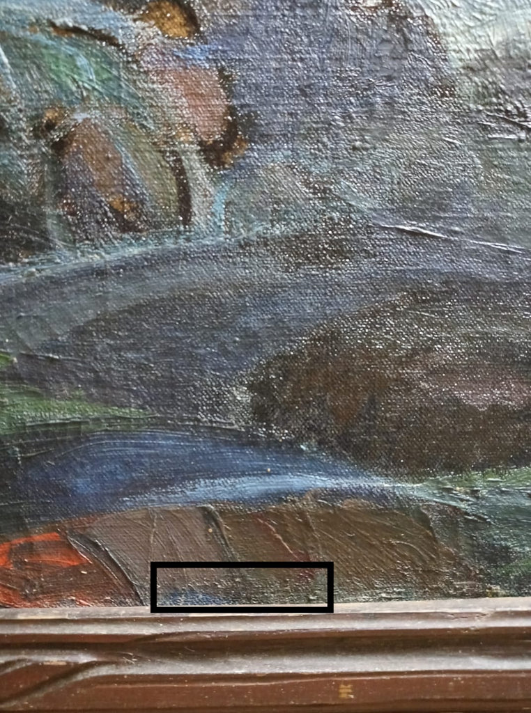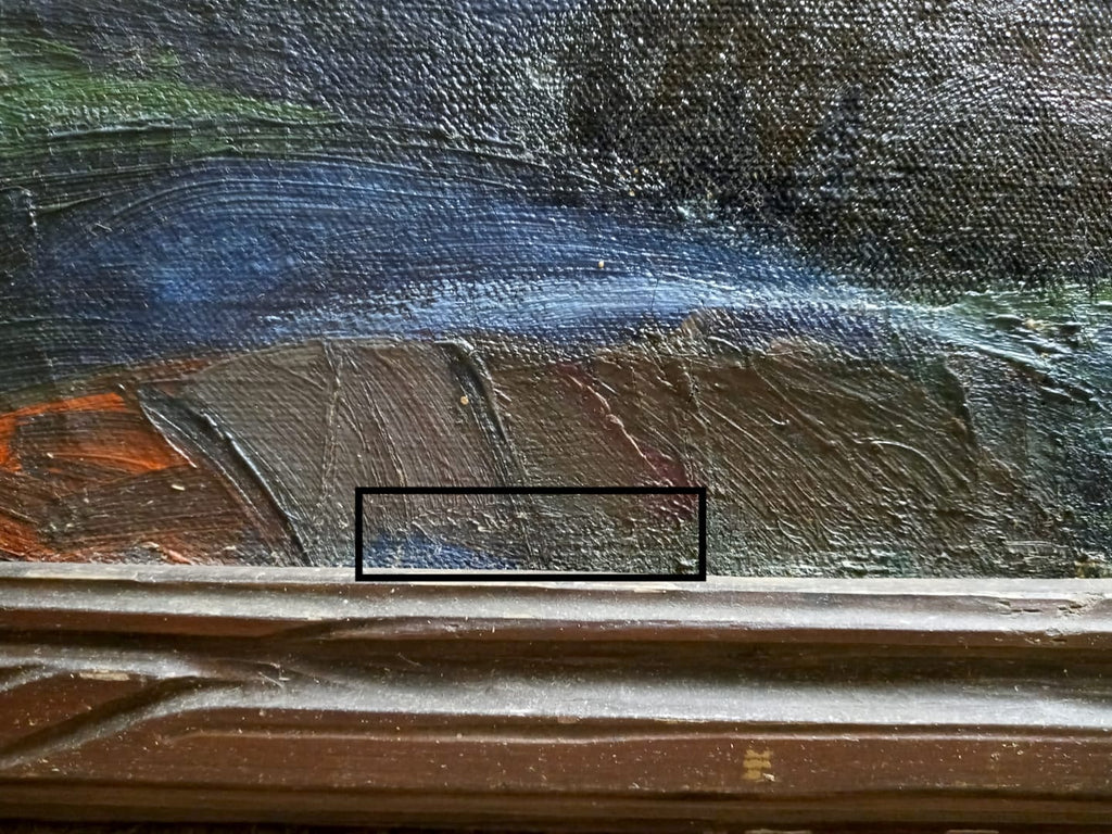 A very lovely painting. The painting's palette and moody atmosphere, as well as the subject, are part of a series Edgar Payne painted of the breaks rocks and coast in Laguna Beach, California. The painting is in good and stable overall condition. There were two very tiny, (less than 1/8 of an inch), chips in the middle of the painting, that have had overpaint for correction, and there is some craquelure, (not deep), as shown. This could be corrected with a nice thicker layer of professional varnish; (this would also be recommended for long-term preservation, from sunlight). There are no other restorations; other than this, the painting is completely original. Edgar Alwin Payne original seascape oil painting alone measures approximately 19"X25". In original, antique, wood carved Arts and Crafts Era Newcomb Macklin frame; the painting measures approximately 28"X 22". The painting is signed, lower center, along the very bottom edge; (emphasized inside of the black rectangular annotation box). It is estimated this painting was done around 1909-1910; (the painting is very old). Painting still retains the old nails holding the back of the canvas, to the original wooden stretcher frame.
