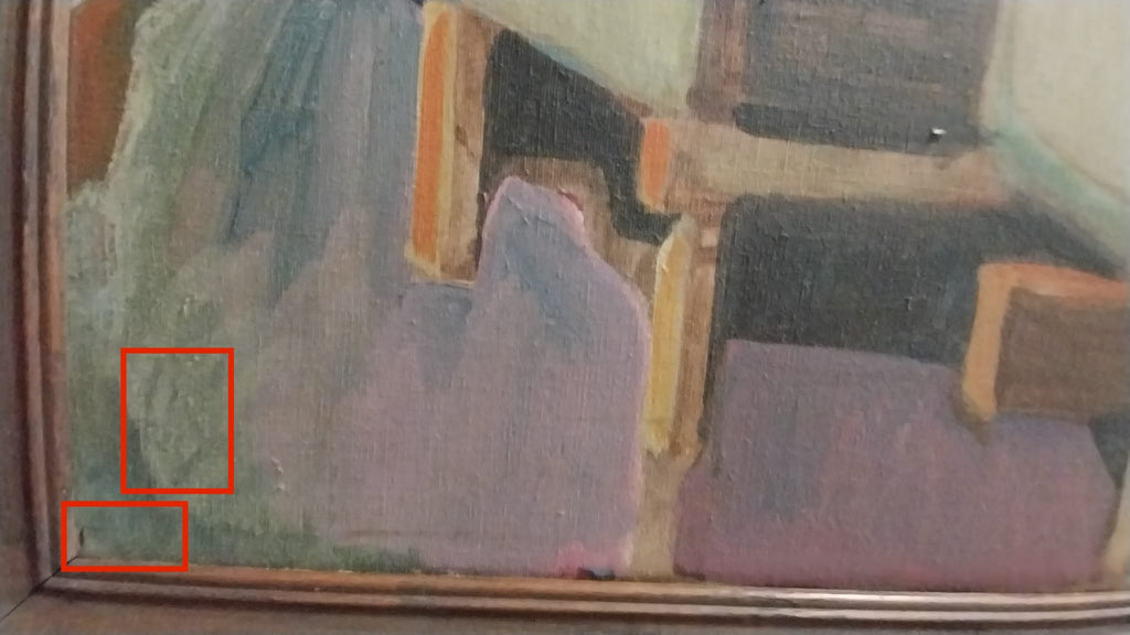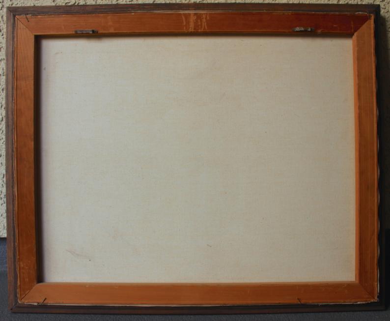 The painting is in very good original condition and is still housed in the original, vintage, wood frame. There have been no overpaints, or chemical cleans performed. There is a small nick in the painting, with missing paint, as shown, in the middle, below the window. Please review the images.