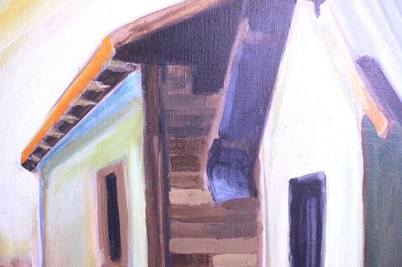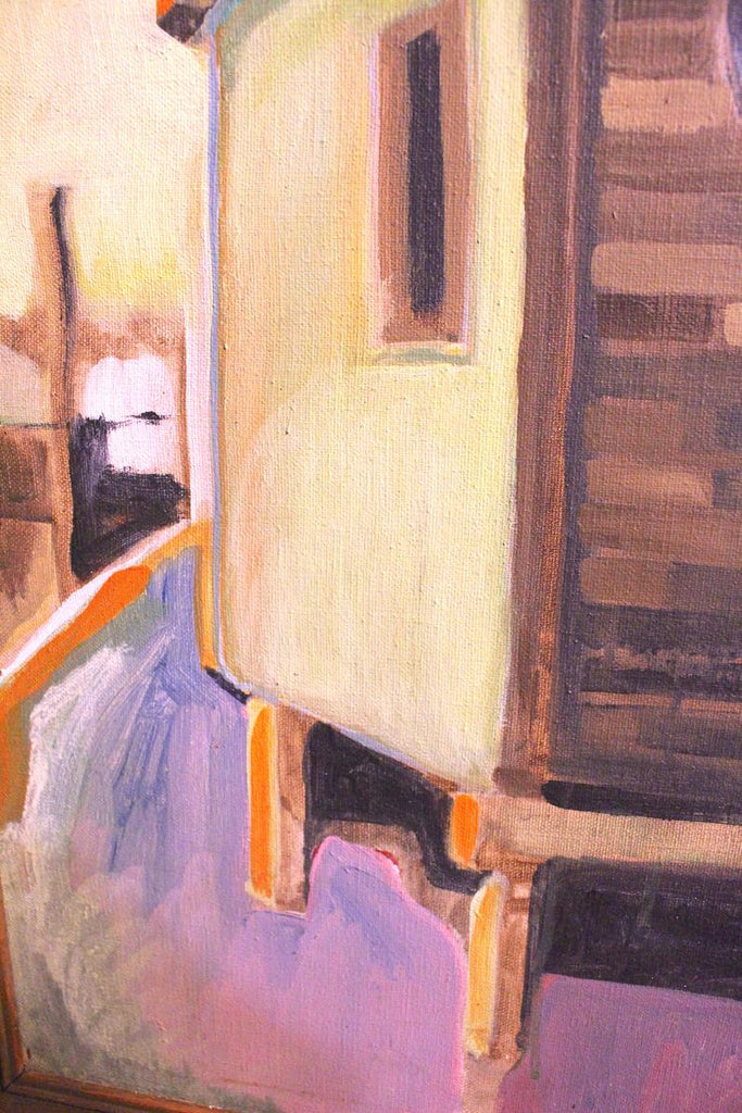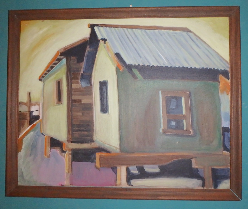 Original vintage San Francisco Bay Area Figurative oil on canvas painting by Raimonds Staprans. The painting is dated '55 under the artist's signature and is a striking figurative painting of a floating home houseboat in Sausalito at sunset. An early painting by the artist, this type of architectural work with remarkable color and shadow. is reminiscent of Edward Hopper's work.