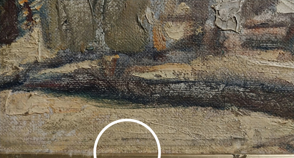 The first label on the reverse, and the oldest, is the inset label viewable through a gallery wrapping opening, verso: