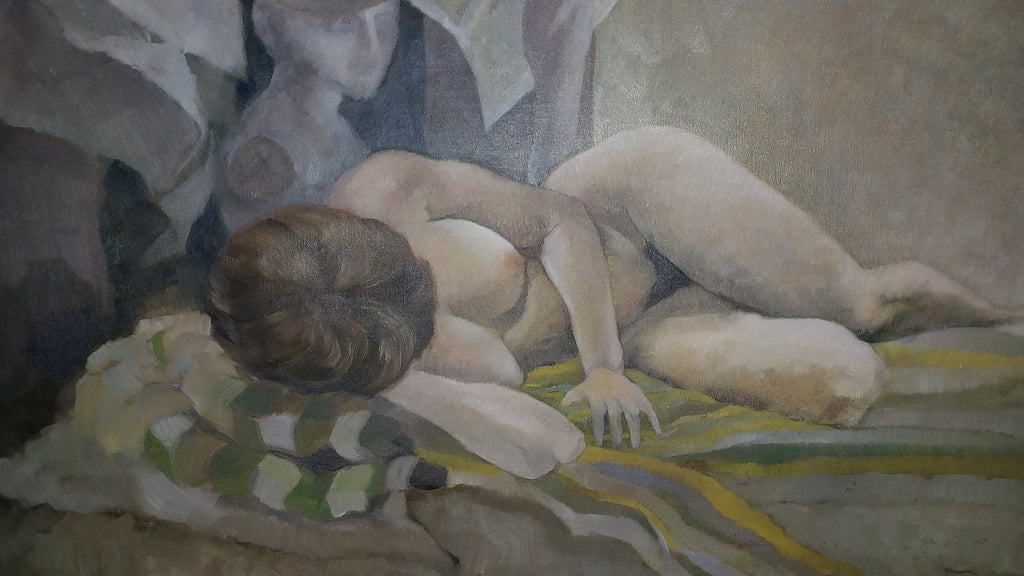 Original, vintage London School oil on canvas painting by contemporary Post- War British artist Michael James Andrews (1918-1995). The painting is a composition with a mannequin bust and female nude, with the female subject laying on her side. The painting is a very good example of the artist's technical precision and skill. The painting in very good condition, and measures approximately 24.10" x 30.8", sans frame. In frame, the entire artwork measures approximately 36.75" x 30.65". The painting remains housed in the original vintage frame, and is signed in the far lower right corner, lightly in the lower center, and lightly in the far lower left corner, with some notations by the artist, verso, on the canvas.