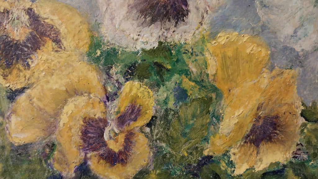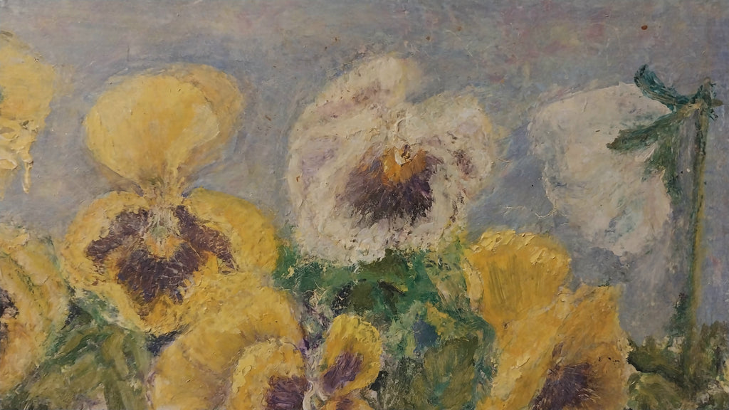Original, vintage floral still life of pansies under a blue sky oil painting on masonite board, by Russian avant- garde painter, and Jack of Diamonds group co-founder, Robert Rafailovich Falk, (1886-1958). The painting alone measures approximately 6.1" x 11.9". In frame, the entire artwork measures approximately 14.65" x 8.8". The painting is all original, in excellent condition, and signed by the artist in the upper right corner. Please review all images as supplemental to the written condition report.