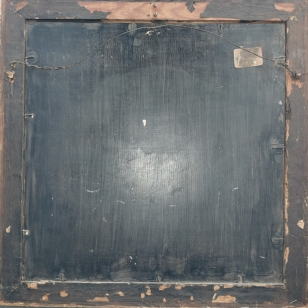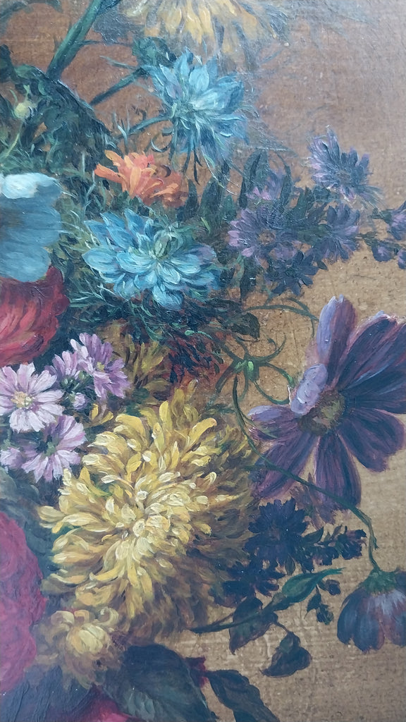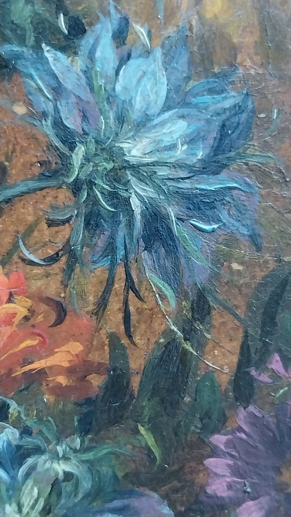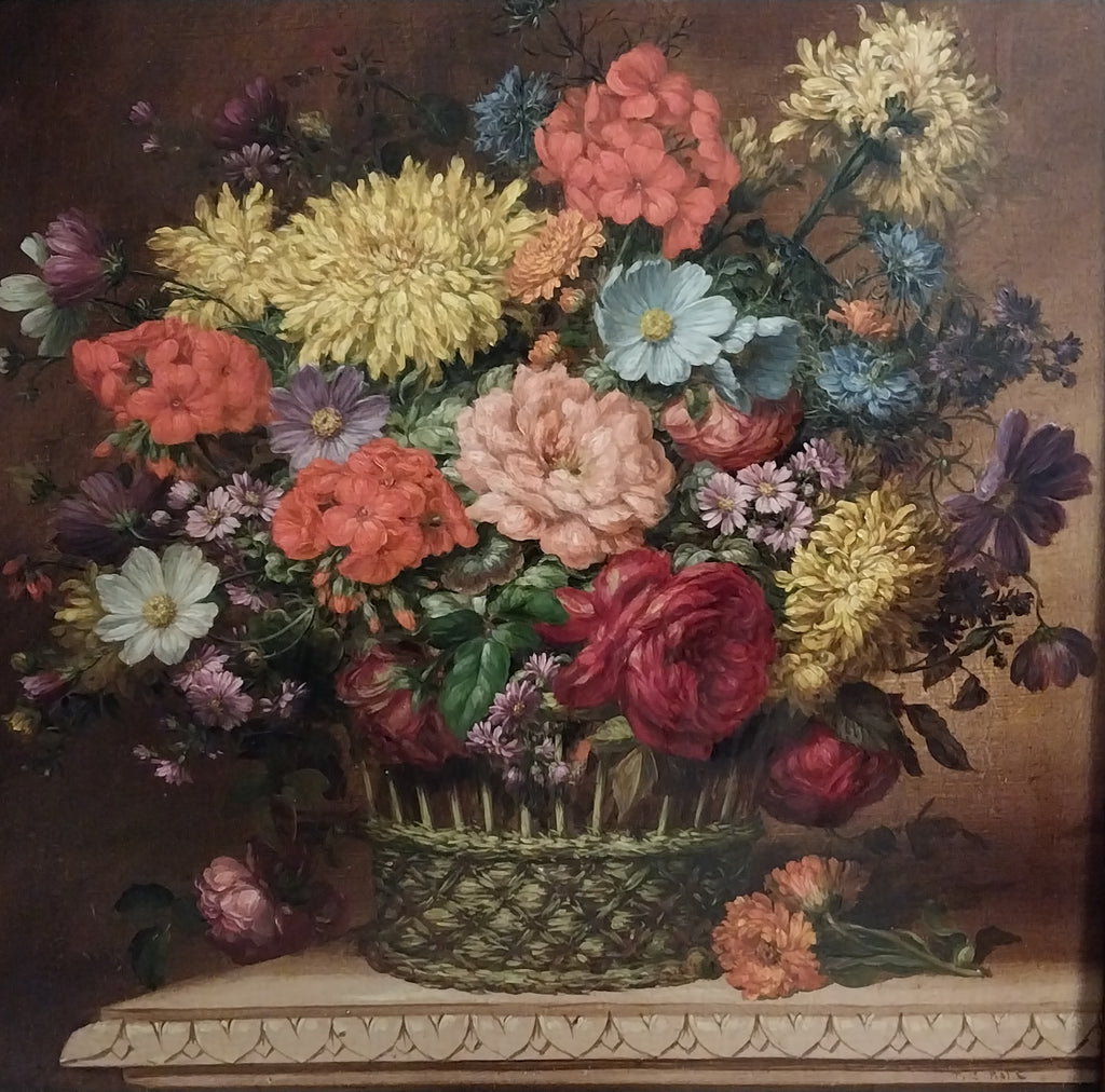 Original antique floral still life oil on board painting of roses, peonies, blue cosmos, hydrangeas, chrysanthemums, and other flowers in a basket on a carved table, by American Indiana Hoosier Group artist, Theodore Clement Steele, (1847-1926). The table has a carved design that resembles heart shapes, and was likely a gift for his second wife, created in approximately 1908. The layers of impressionism are awash in vibrant color. The painting is in very good to excellent original condition, and is signed in the lower right. The painting measures appeoximately 14" x 14", sans frame. In frame, the entire artwork measures approximately 15.8" x 15.8". The painting is still housed in the original antique frame, and is in stable condition, but could use restoration. Please carefully review all images as a necessary and supplemental addition to the written condition report, for quality assurance.