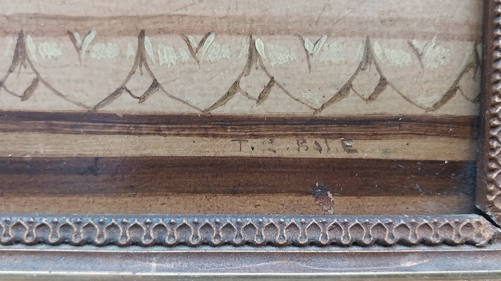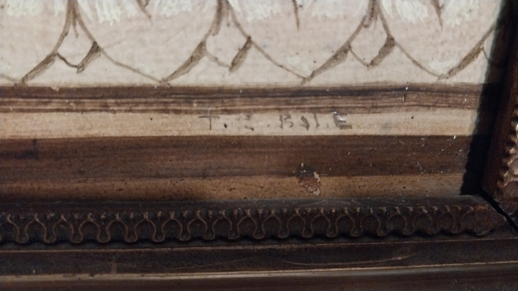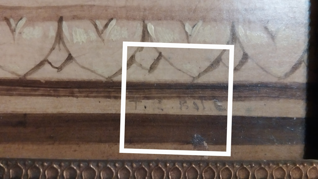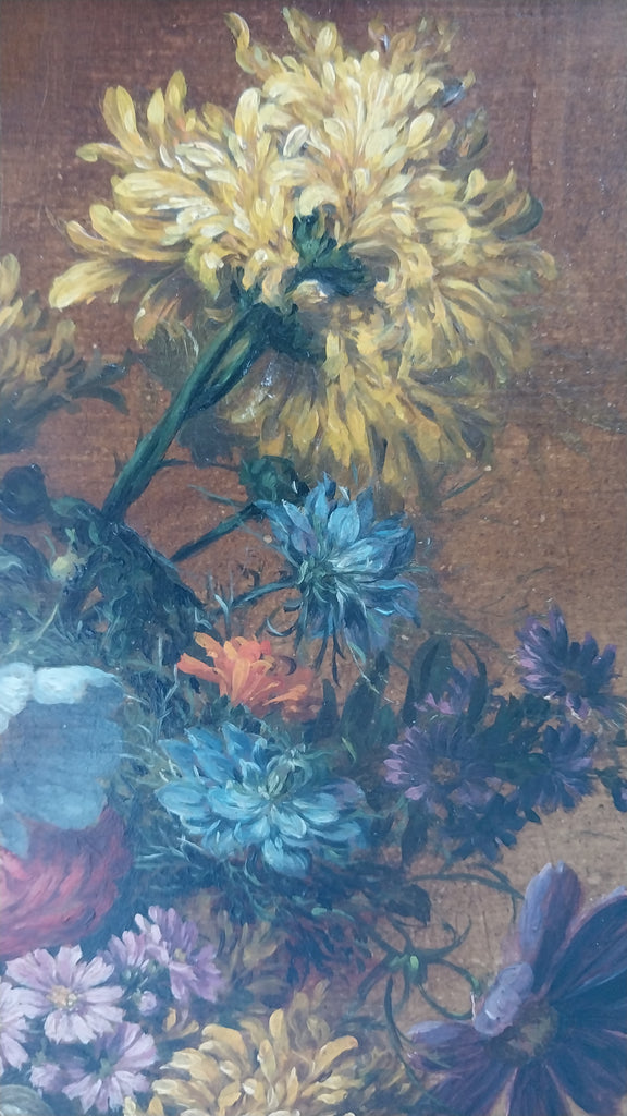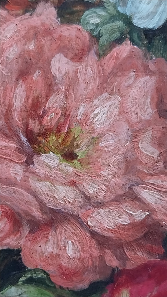 Original antique floral still life oil on board painting of roses, peonies, blue cosmos, hydrangeas, chrysanthemums, and other flowers in a basket on a carved table, by American Indiana Hoosier Group artist, Theodore Clement Steele, (1847-1926). The table has a carved design that resembles heart shapes, and was likely a gift for his second wife, created in approximately 1908. The layers of impressionism are awash in vibrant color. The painting is in very good to excellent original condition, and is signed in the lower right. The painting measures appeoximately 14" x 14", sans frame. In frame, the entire artwork measures approximately 15.8" x 15.8". The painting is still housed in the original antique frame, and is in stable condition, but could use restoration. Please carefully review all images as a necessary and supplemental addition to the written condition report, for quality assurance.