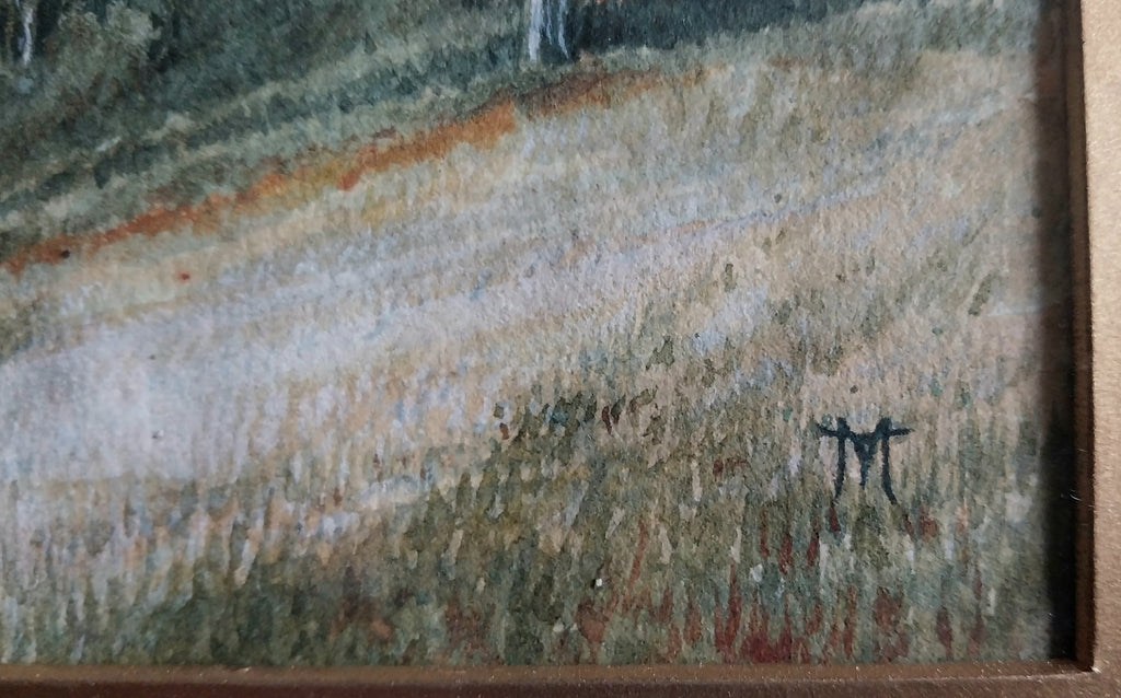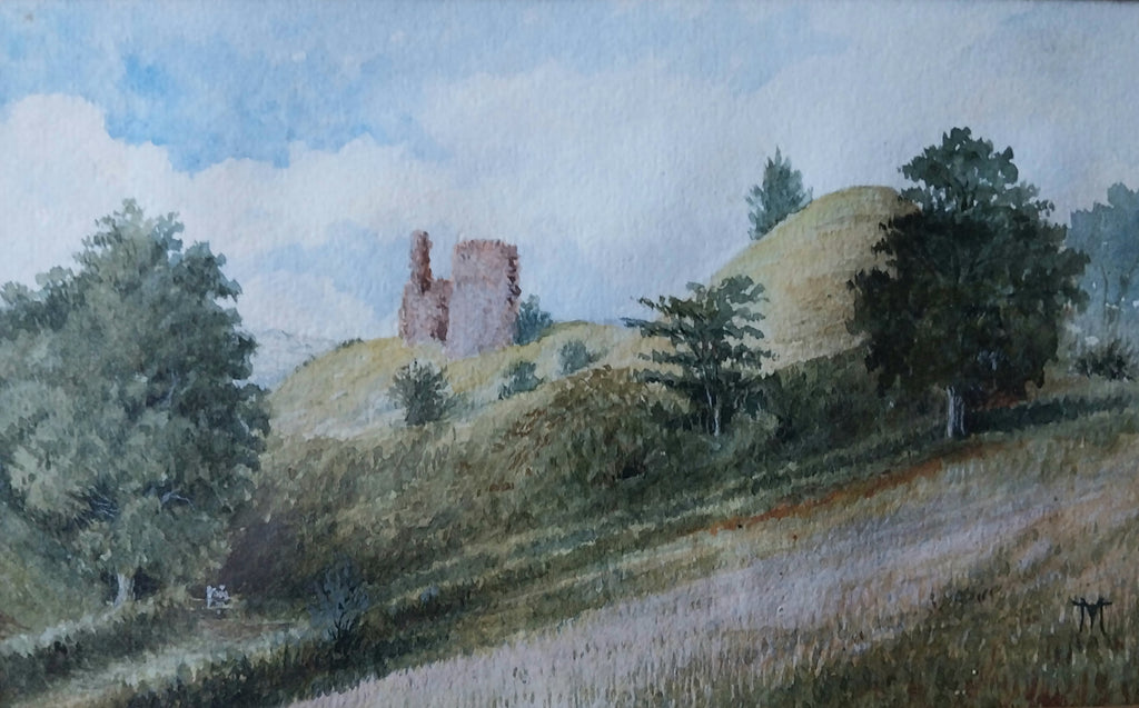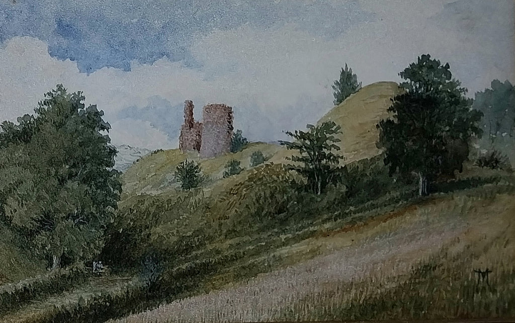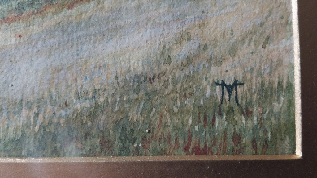Original, antique, 19th century watercolor / watercolour painting on paper of Strathaven Castle in Scotland, by British born American Hudson River School painter, Thomas Sidney Moran (1837-1926). The painting is the painting for which an etching was created later, in approximately 1882. Thomas Moran, motivated by his wife, (Mary Nimmo Moran), who was born in Strathaven, traveled to Scotland in 1882, and produced numerous works, inspired by the scenery. The painting alone measures approximately 8.70" x 5.25", plus frame. In frame, the entire artwork measures approximately 12.25" x 15.25. The antique gold mat is original to the painting, however, the frame is not original. The painting is in very good to excellent condition, and is signed with the artist's monogram in the lower right corner of the painting.
